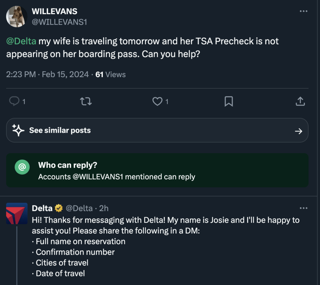 Look at how Delta Airlines handled a specific request from a customer below. They responded to the issue in a timely manner and helped the customer. Automation would have led to a generic response and the customer becoming more flustered before their wife set off for travel.